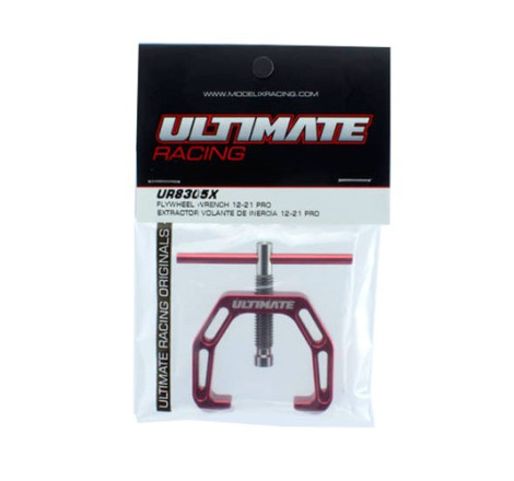 This is the updated Ultimate Racing Flywheel Remover .12-.21 Pro. By clamping the red anodized aluminum fork behind the flywheel and turning the shaft the flywheel is pulled away from the crankshaft, eliminating the need to use a hammer or other tools to loosen a tightly fitted flywheel.