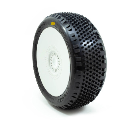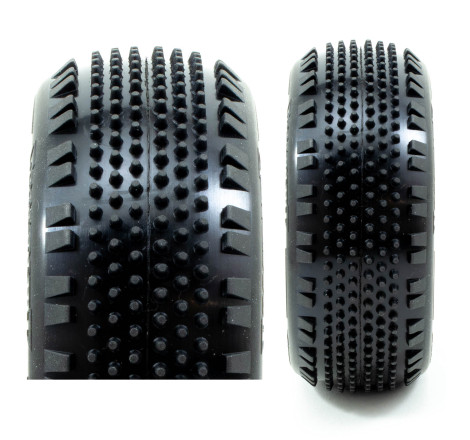 The Stinger tire is specifically designed for high-grip carpet tracks. It features a central pattern of long, spaced pins, combined with angled side blocks, delivering direct forward traction while reducing excessive side bite at high speeds. This results in a cleaner, more controlled cornering, ideal for front-end setups or configurations that prioritize easy and predictable handling.