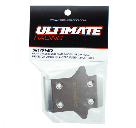 This is the Ultimate Racing Front Chassis Skid Plate for Mugen1/8 Off Road. Intended for the MBX8 and MBX8R platforms, this front skid offers increased protection keeping your chassis safe from wear. Constructed from 0.5mm stainless steel this skid is built to last and is one of the easiest ways to protect your vehicle. Package includes one silver color skid with Ultimate Skid Plate laser engraved