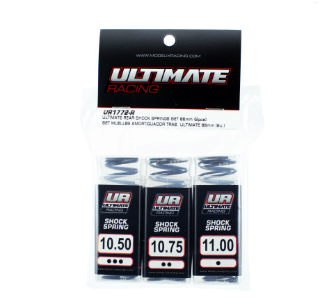 This is a set of 6 optional 86mm Rear Shock Spring Set from Ultimate Racing. It’s intended for the majority 1/8 off road cars with 16mm shocks like Mugen, Kyosho, Losi, Sworkz, Xray, Mayako, etc. These shock springs allow you to optimize the suspension of your buggy for the various types of terrain and handling characteristics you desire.